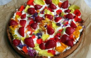 Zurück zum Naturfreundehaus klang die von Anfang bis Ende interessante Kräuterwanderung bei Kaffee und Kuchen aus. Dazu wurden zwei mit Dinkelmehl und Mandeln gebackene Tortenböden mit Sahne und Aprikosenmarmelade bestrichen und mit den eingesammelten Blüten belegt. Ein Genuss – wie alle Teilnehmer der Wandergruppe bestätigten. Der Informationsaustausch und die Diskussionen gingen am „runden“ Tisch natürlich weiter. Ein durch und durch gelungener Nachmittag! Es war zwar die erste, aber nicht die letzte Wanderung dieser Art. Da der Zuspruch so enorm war, denken wir daran, im nächsten Jahr zwei weitere Kräuterwanderungen zu verschiedenen Jahreszeiten ins Programm zu nehmen. Die Termine werden wir rechtzeitig bekannt geben. Ich jedenfalls freue mich jetzt schon darauf!